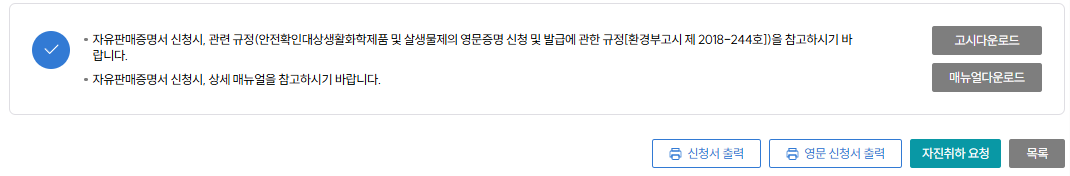 ② 자유판매증명 신청 에서 해당 접수번호 클릭 시 한글 신청서 및 영문 신청서 전자문서(PDF) 출력이 가능합니다.